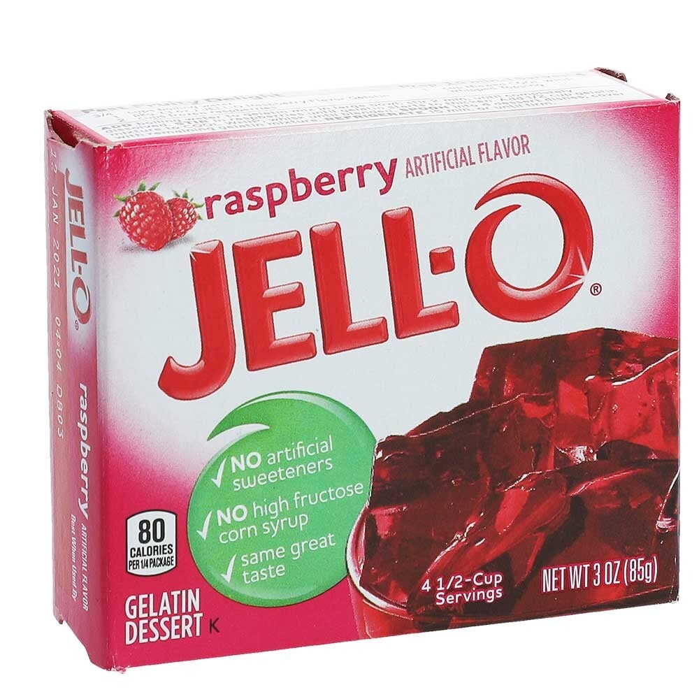 Jell-O Raspberry is een geleipoeder voor het maken van Jell-O met frambozensmaak. Het kan in een mum van tijd worden bereid door eenvoudigweg warm en koud water toe te voegen om ongeveer 1 liter van het heerlijke dessert te maken. Deze geleipudding met zijn fruitige aroma is ideaal om te verrijken met frambozen en zo te genieten van dubbel fruitgenot. Verse room of romige vanillesaus onderstreept je eigen smaak en nodigt uit om ervan te snoepen.