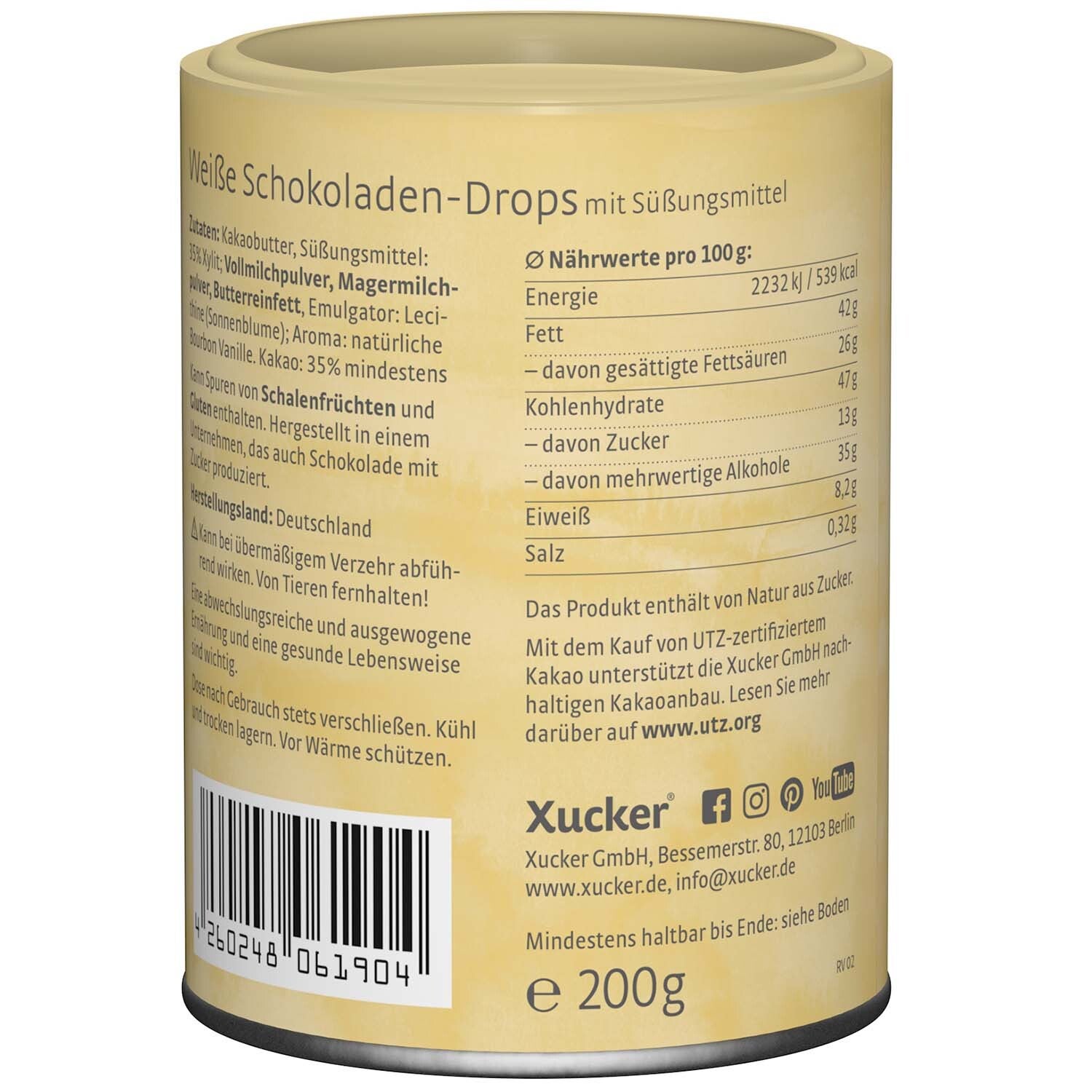 De druppels zijn nog lang niet opgezogen. Met deze zoete lichtheden kun je zorgeloos genieten. Xucker White Chocolate Drops met witte chocolade zijn ideaal voor het decoreren van taarten, muffins, enz. Ze smaken ook bijzonder lekker in muesli en zijn dankzij de hersluitbare verpakking bijzonder gemakkelijk te bewaren.