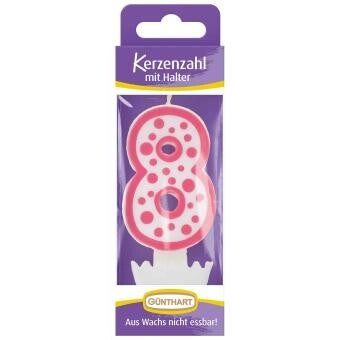 Ideaal voor alle verjaardagen! Met de prachtige Günthart BackDecor waskaars nummer met houder nr. 8 worden verjaardagstraktaties zoals taarten en taarten perfect afgerond. De uitvoerig vormgegeven waskaars is verkrijgbaar in de kleuren blauw, roze en geel. Met het stippenpatroon is het een geweldige blikvanger op elk feest.