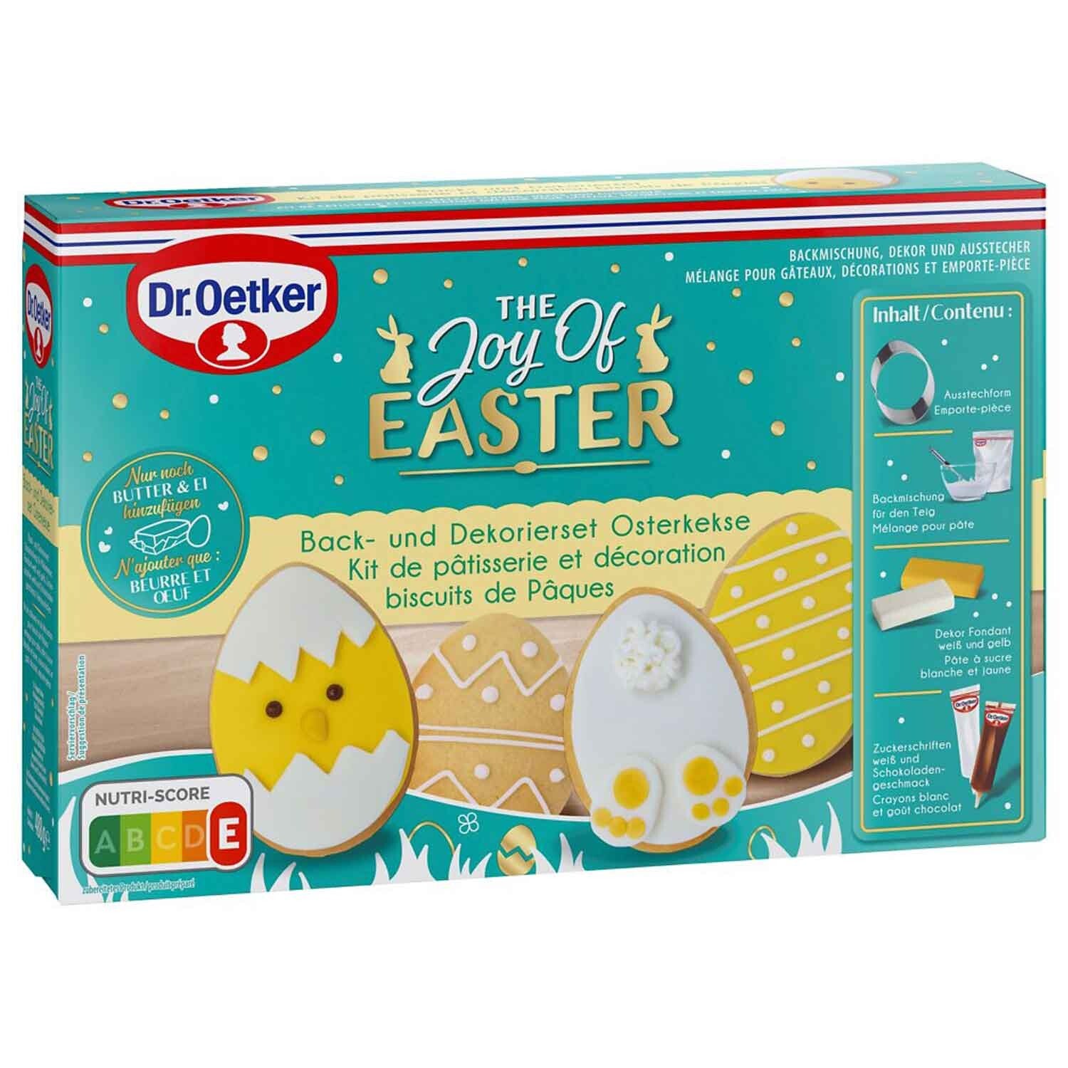 Veel bakplezier voor de Paasdagen. Met de grote Dr. Oetker Paasbak- en decoratieset wacht op u met paasplezier voor het hele gezin. In deze set vind je een bakmix voor heerlijke paasgebakjes in de vorm van delicate koekjes. Een praktische eivormige koekjesvormer, wat fondantmengsel en twee verschillende suikerlettertypen bieden volop ruimte voor creativiteit. Om de koekjes te bereiden hoef je alleen maar een ei en een beetje boter toe te voegen. Deze worden vervolgens met de mal uitgesneden en in de oven gebakken. De zoete lekkernijen kunnen vervolgens naar wens worden versierd met suikerschrift en fondant. Een geweldig idee voor paastijdverdrijf.