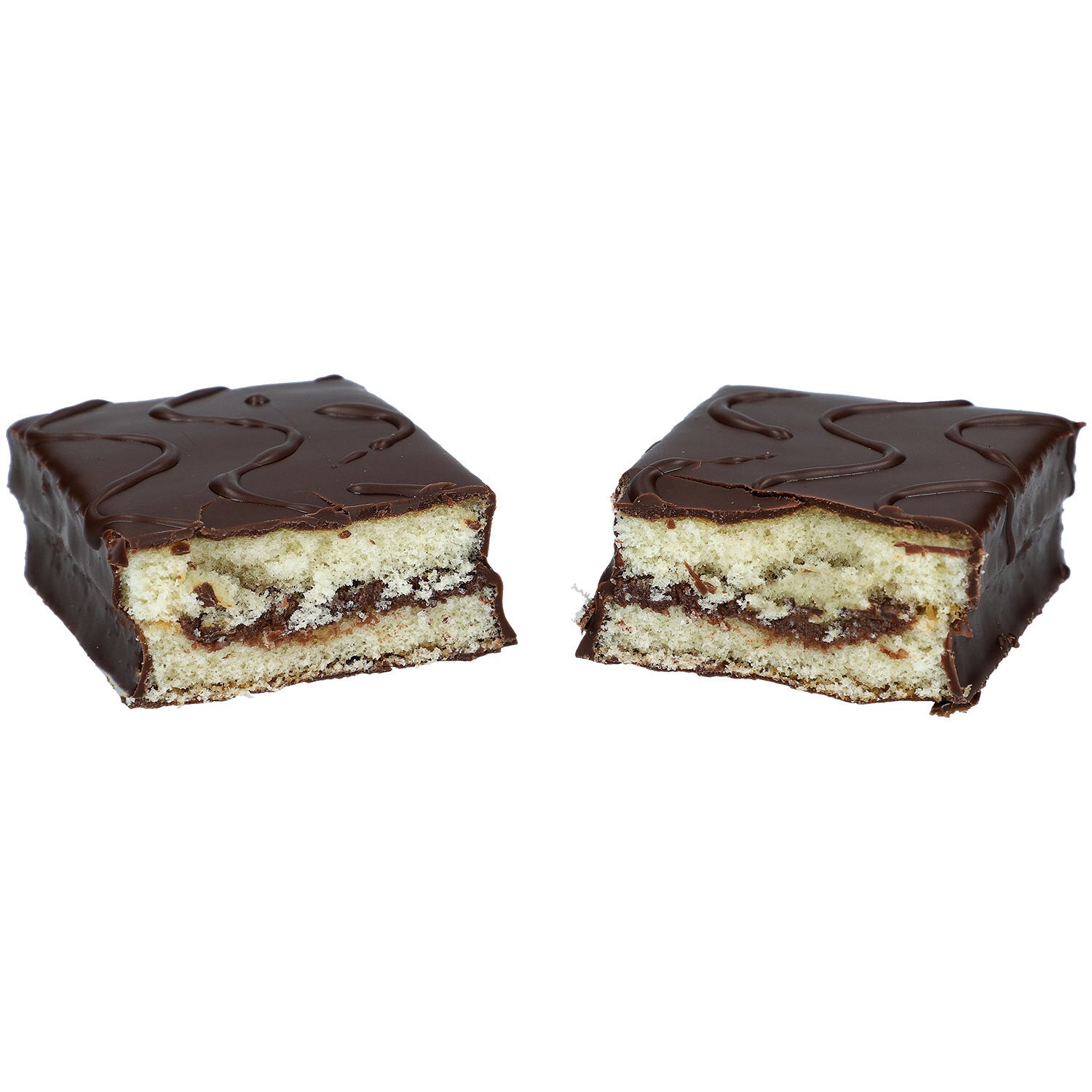 8 individueel verpakte biscuitgebakjes met cacao crèmevulling en vetglazuur op cacao-basis.