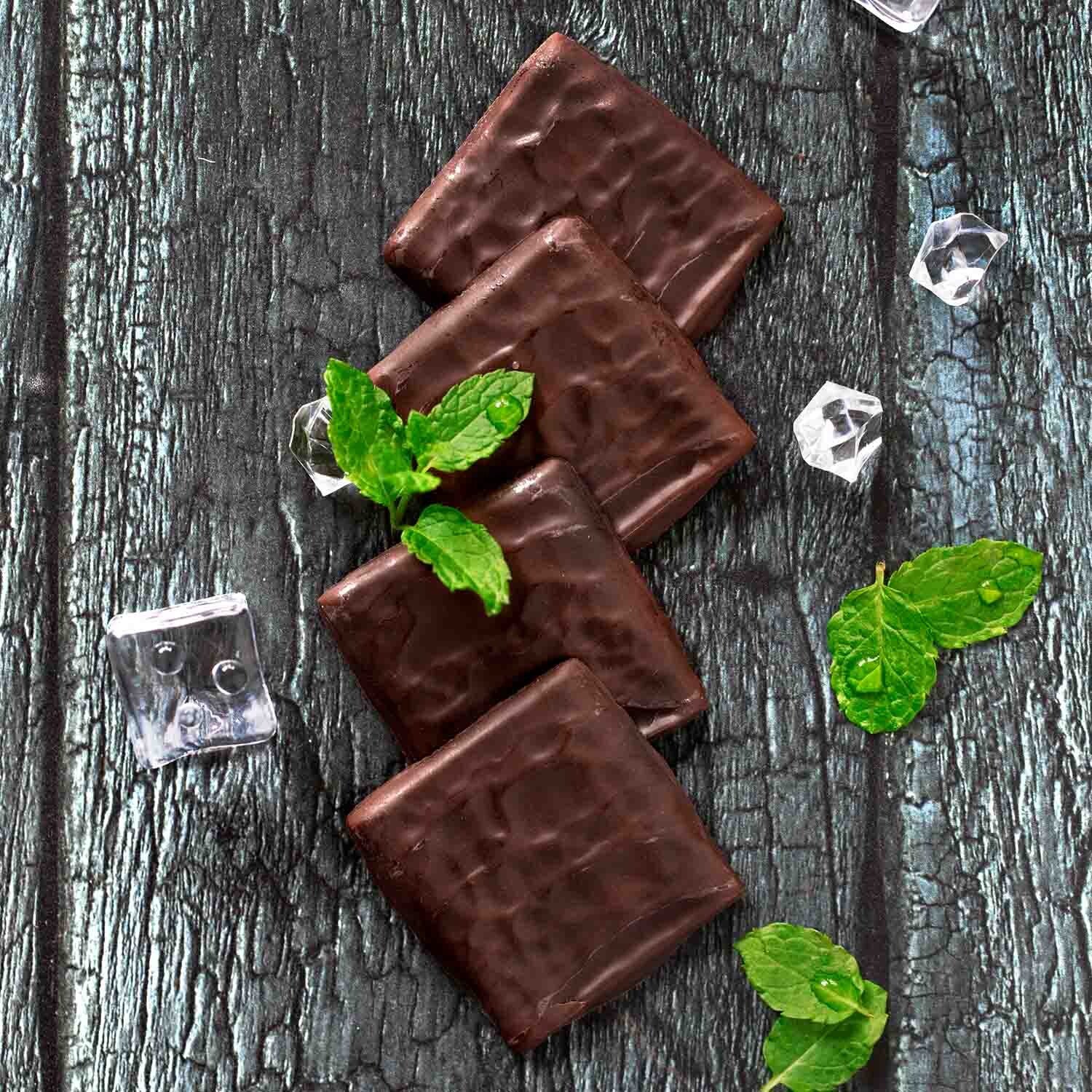 21 individueel verpakte, flinterdunne chocoladerepen met pepermuntcrèmevulling en pure chocoladecoating.