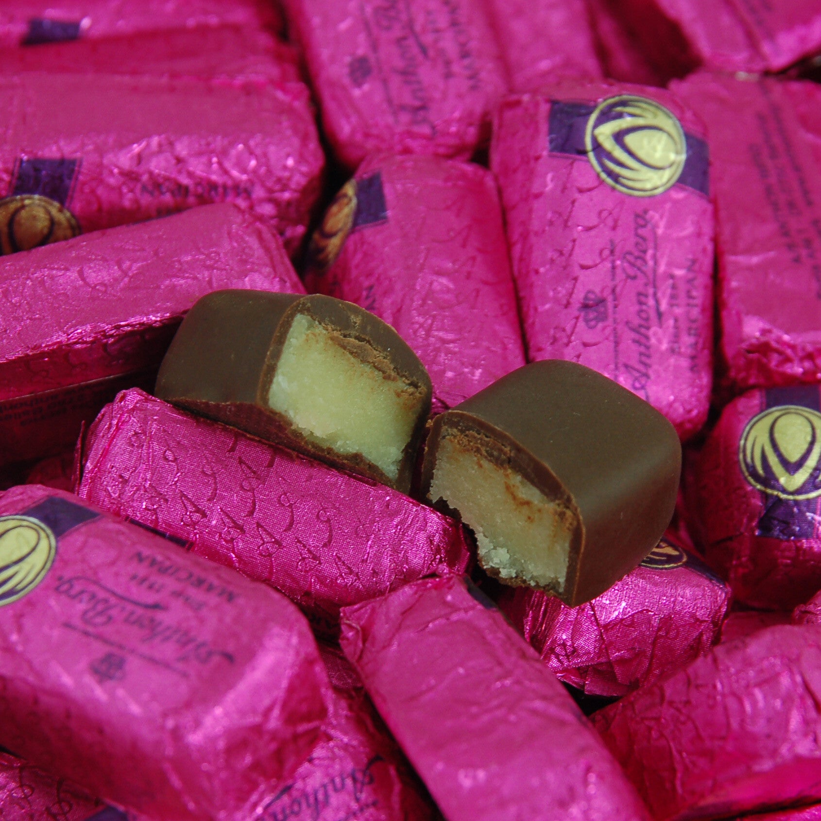 30 individueel verpakte marsepeinchocolaatjes omhuld met pure chocolade.