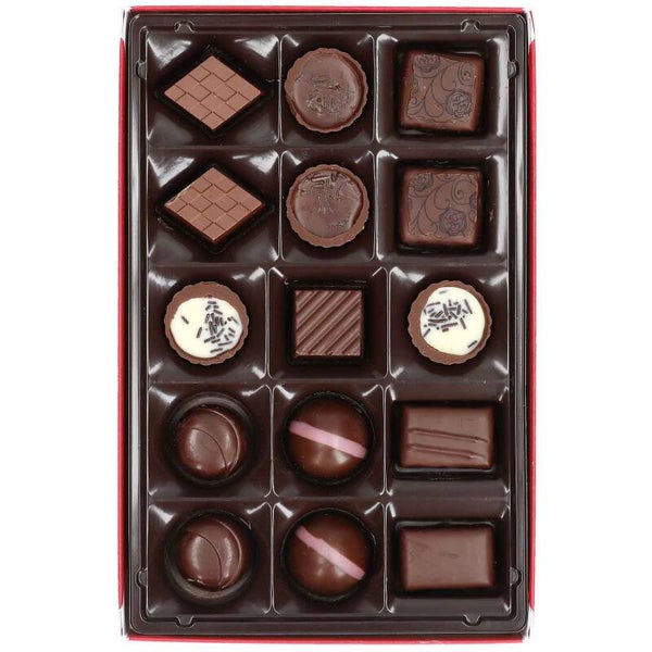 Ingrediënten: suiker, cacaomassa, cacaoboter, AMANDELEN, VOLLE MELKPOEDER, MELKVET, invertsuikerstroop, gecondenseerde MELK, stabilisator (sorbitolsiroop), glucosestroop, sinaasappel, fructosestroop, plantaardig vet (palm, sheannoot), HAZELNOTEN , cognac, likeuren, kirsch, emulgator (lecithinen), whisky, maltodextrine, aardbeienconcentraat, LACTOSE, kersenpuree, kersensap, lycheeconcentraat, voedingszuur (citroenzuur), aroma's, bourbon vanille-extract, bevochtigingsmiddel (invertase), vetarm cacaopoeder, kleurstoffen (rode biet, karmijn), alcohol, ruwe suikerstroop, verdikkingsmiddel (pectine), zout. Kan sporen bevatten van andere noten, soja en ei.