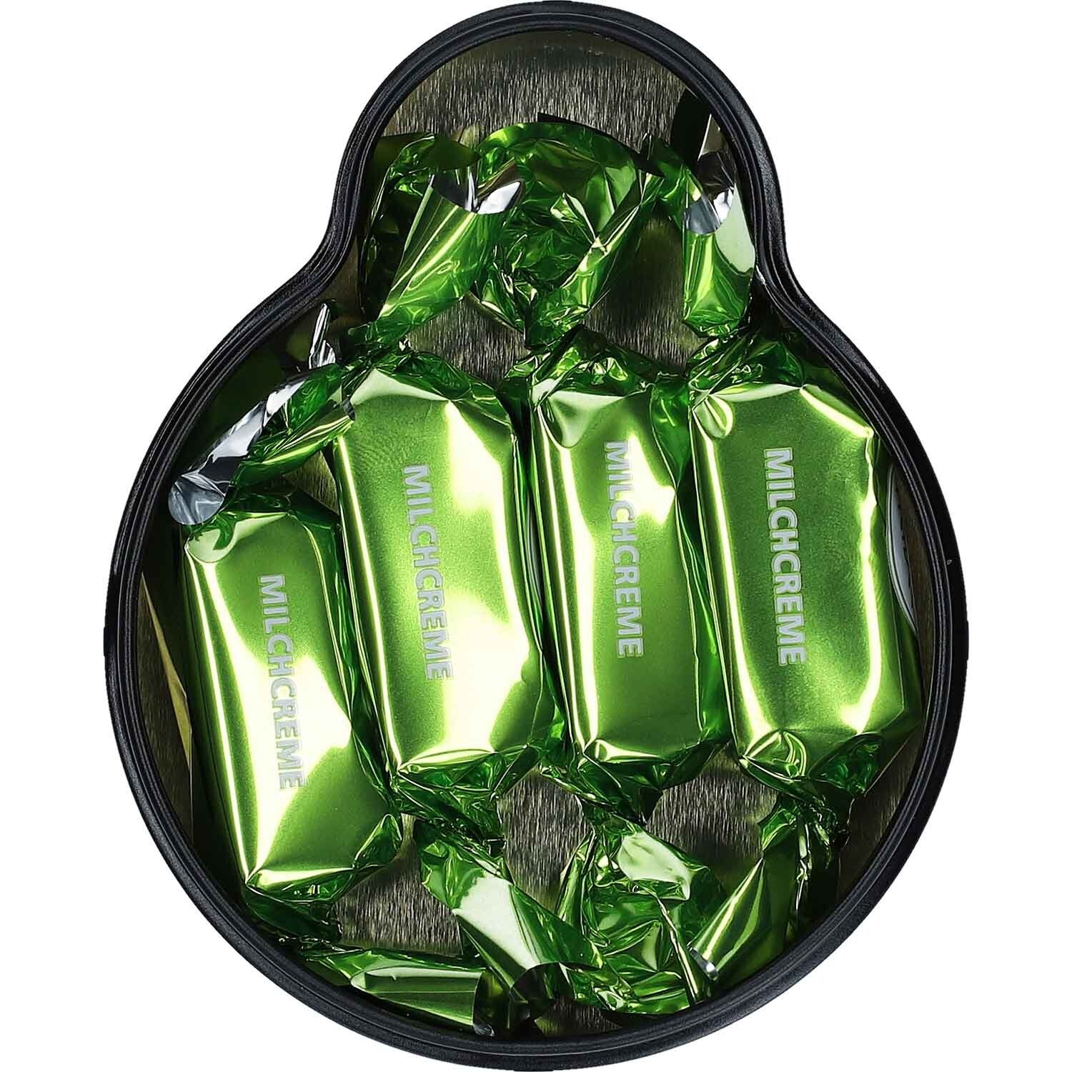 Metalen blik met 4 individueel verpakte chocoladepralines met melkroom.