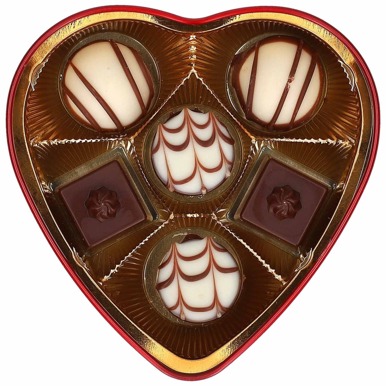 Hartvormig metalen blikje met reliëf en mini-pralinémix, 3 assorti.