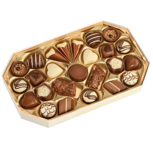 Ingrediënten: suiker, cacaoboter, volle MELKpoeder, AMANDELEN, HAZELNOTEN, cacaomassa, magere MELKpoeder, zuiver BOTERvet, MELKsuiker, dextrose, glucosestroop, plantaardig vet (palm, kokosnoot), glucose-fructosestroop, ROOMpoeder, invertsuikerstroop, Marc de Champagne, sinaasappelschil, citroenschil, emulgator (SOJA- en zonnebloemlecithine), volle MELK, koffie, TARWEbloem, alcohol, natuurlijke aroma's, bevochtigingsmiddel (invertase), GERSTEMoutextract, ROOM, aroma's, zuurteregelaar ( citroenzuur), zout, magere cacaopoeder, citroensapconcentraat, vanille-extract, natuurlijk sinaasappelaroma, karamelsuikersiroop. Kan andere NOTEN bevatten.