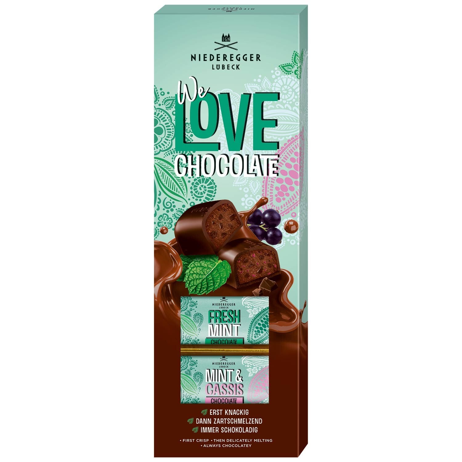 Een verfrissend duo! Niederegger Het heerlijke We Love Chocolate klassieke muntduo verleidt met de aromatische tonen van verse munt. Onder een schelp van knapperige pure chocolade zit een munttruffelcrème die verrast met twee verleidelijke varianten. De variant Chocolate maakt indruk met knapperige chocoladestukjes en bij Cassis kun je je verheugen op de fruitige tonen van sappige bessen.