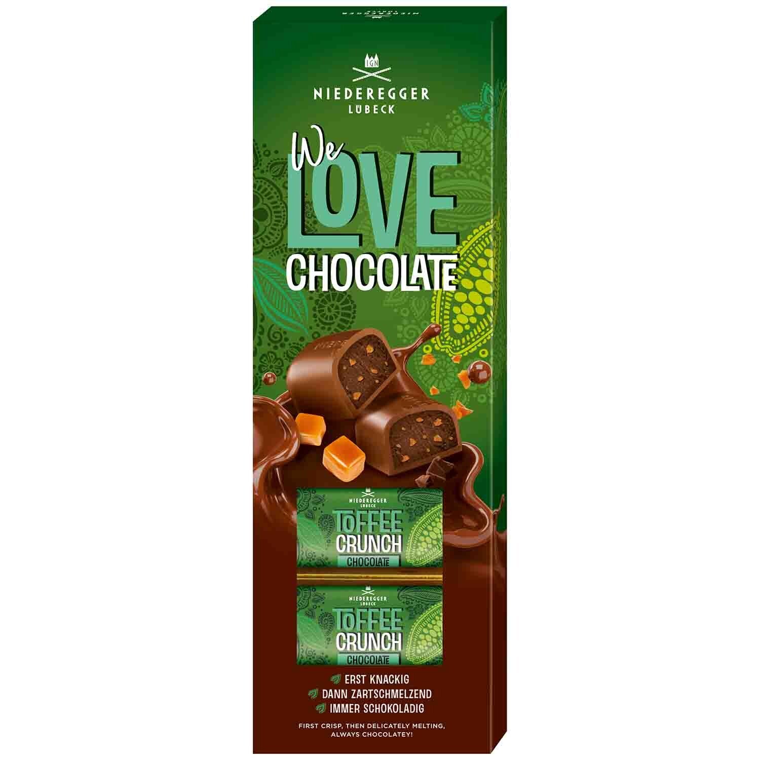 Uit liefde voor chocolade. Niederegger We Love Chocolate Toffee Crunch is een nobele traktatie voor alle chocoladeliefhebbers. De fijne pralines zijn gemaakt van heerlijke volle melkchocolade en verleiden met een delicate vulling van cacaoroom. Dit werd verfijnd met knapperige toffeestukjes, die de zoete lekkernij een volle toets geven. Het bijzondere ontwerp maakt deze chocolaatjes tot een geweldig cadeau-idee voor alle kenners.
