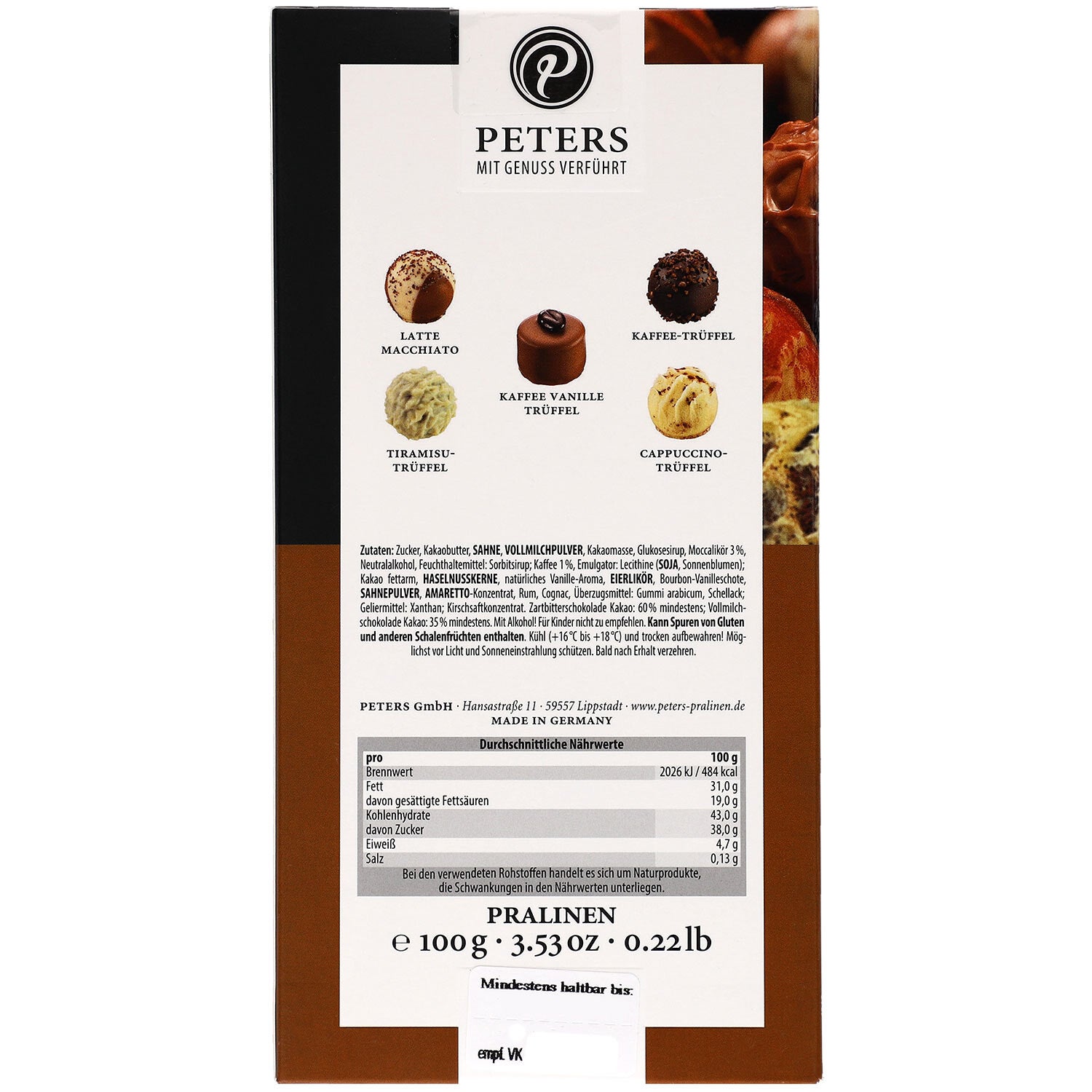 Ingrediënten: suiker, cacaoboter, ROOM, VOLLE MELKPOEDER, cacaomassa, glucosestroop, mokkalikeur 3%, neutrale alcohol, bevochtigingsmiddel: sorbitolsiroop; Koffie 1%, invertsuikerstroop, emulgator: lecithinen (SOJA, zonnebloem); Magere cacao, natuurlijk vanillearoma, HAZELNOTEN, EILOGUR, bourbonvanilleboon, ROOMPOEDER, rum, BOTERVET, cognac, glansmiddel: schellak, Arabische gom; Kersensapconcentraat.