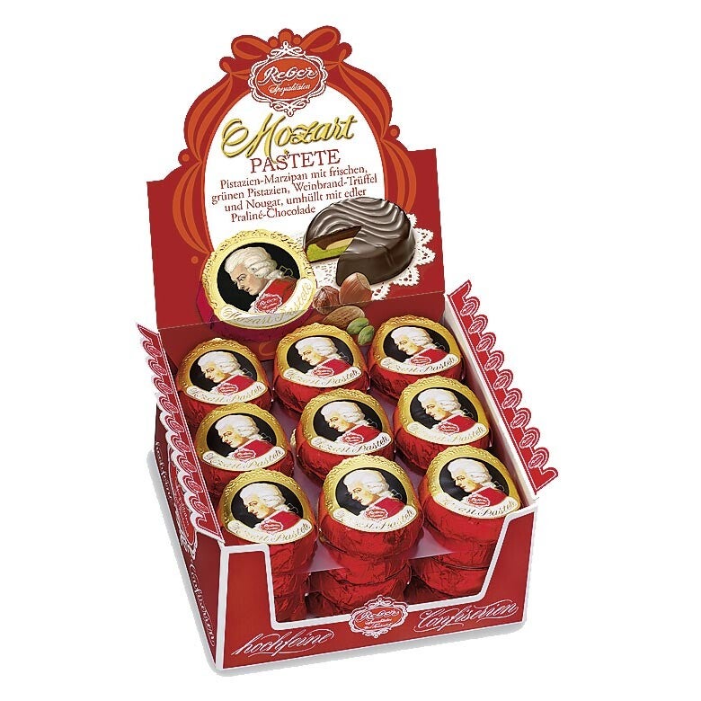 De Mozartkugel in taartvorm. Hier komt veel samen: pure chocolade ontmoet een gevarieerde vulling van pistache-marsepein, cognac-truffels en nougat. Het resultaat: de Reber Mozart-taart. Laat je verleiden door deze klassieke compositie.