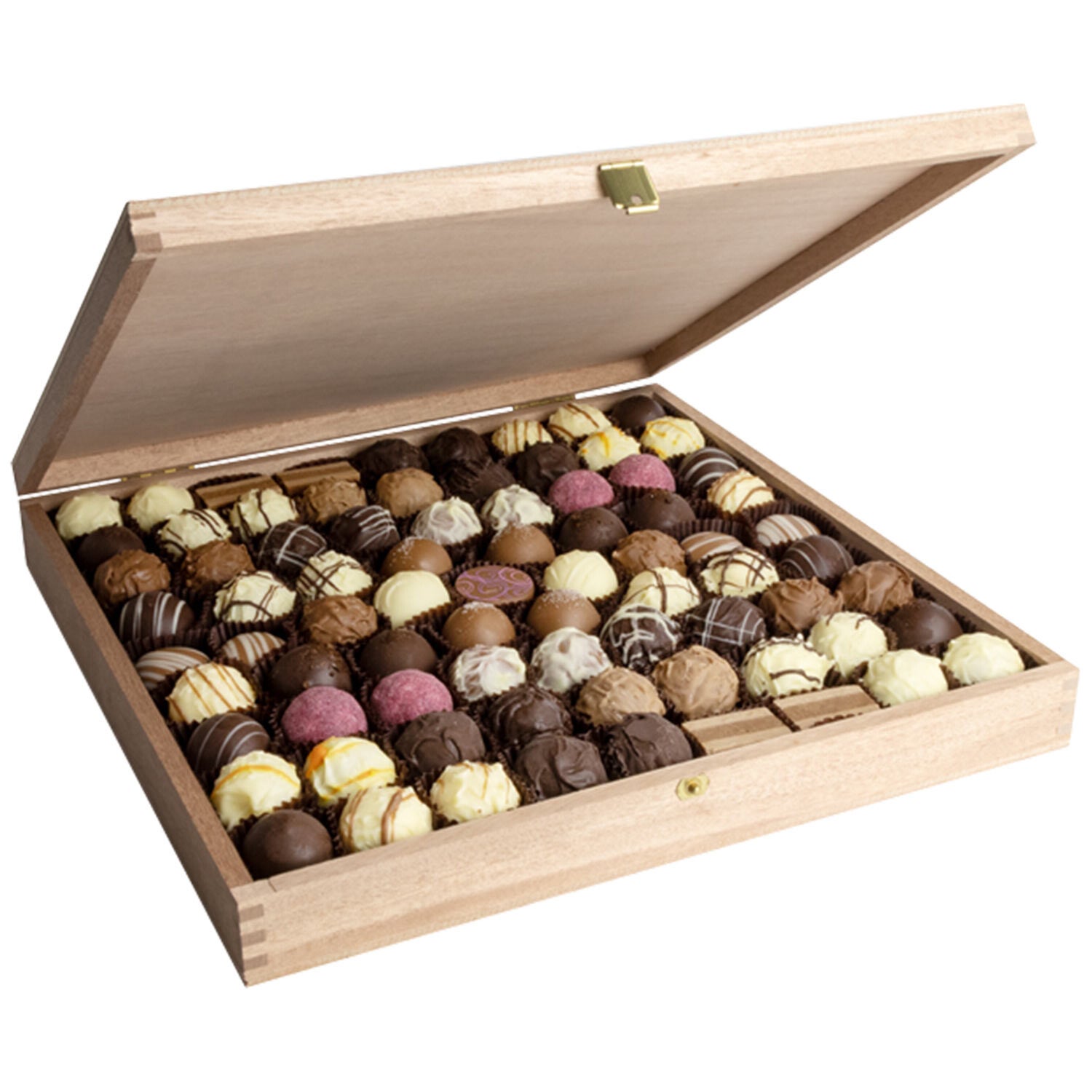 DreiMeister xl houten kist met chocolaatjes & truffelmix 1kg