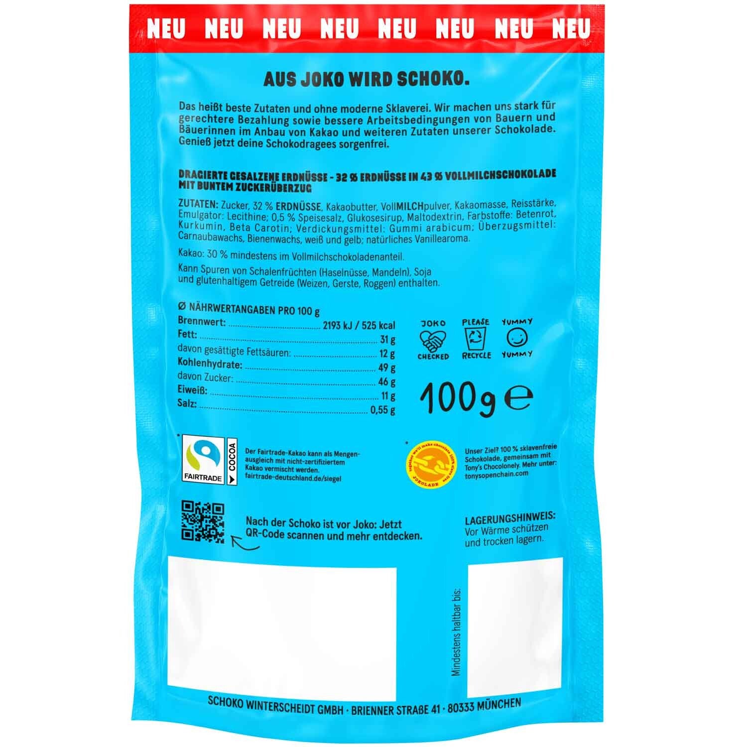 Kleurrijk chocoladeplezier met een zoute noot! De heerlijke JOKOLADE Pinda's gezouten zijn een nieuwe grap van de populaire tv-presentator Joko Winterscheidt, die met zijn chocoladeproducten de eerlijke cacaohandel steunt. Verheug u op gezouten pinda's omhuld met de beste melkchocolade. Een kleurrijke suikerkorst zorgt voor een knapperige bite.