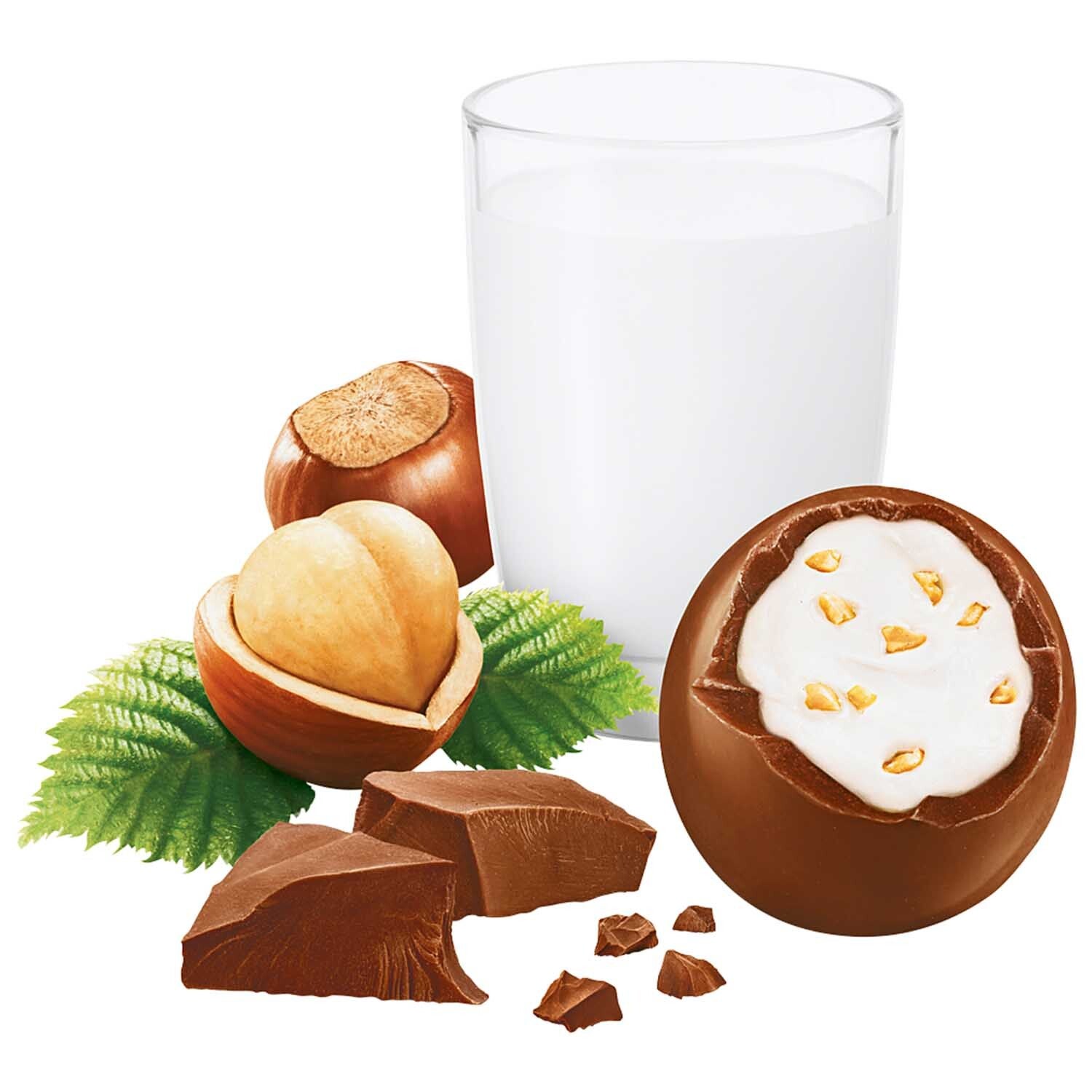 Gevulde melkchocolade-eieren met melkvulling (42,5%) en fijngehakte hazelnoten.
