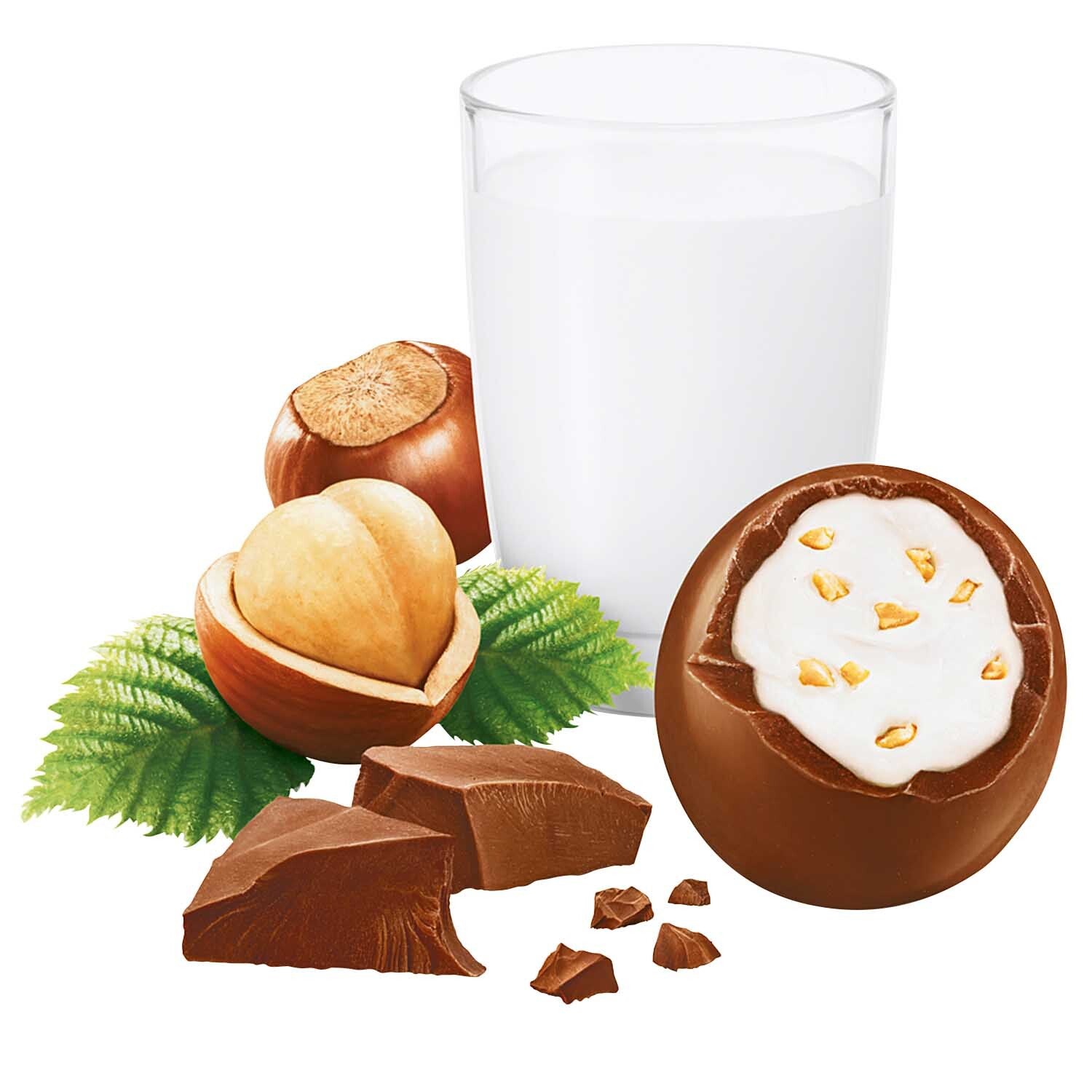 Gevulde melkchocolade-eieren met melkvulling (42,5%) en fijngehakte hazelnoten.