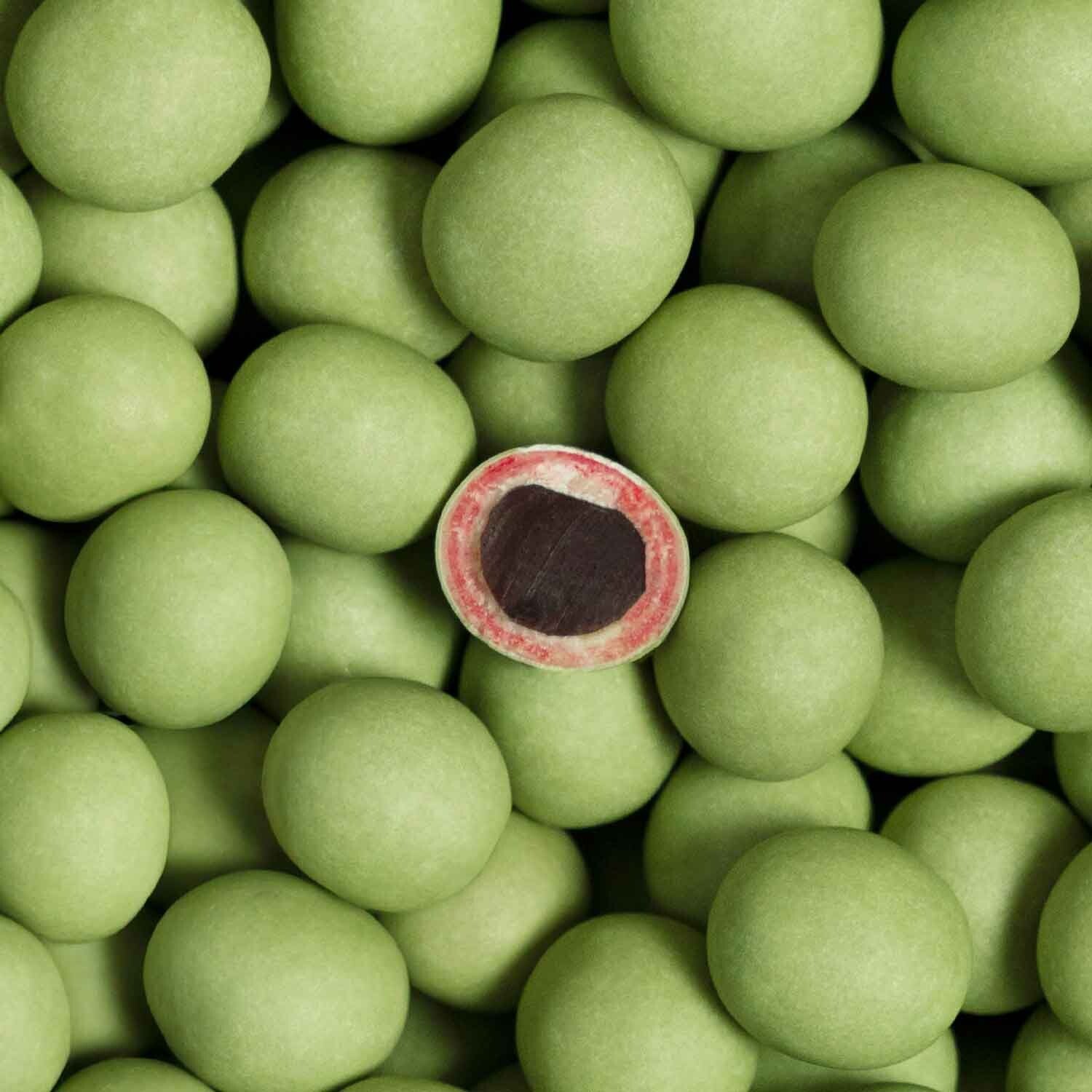 Gecoate witte chocoladebolletjes met twee smaken en een zachte dropkern.