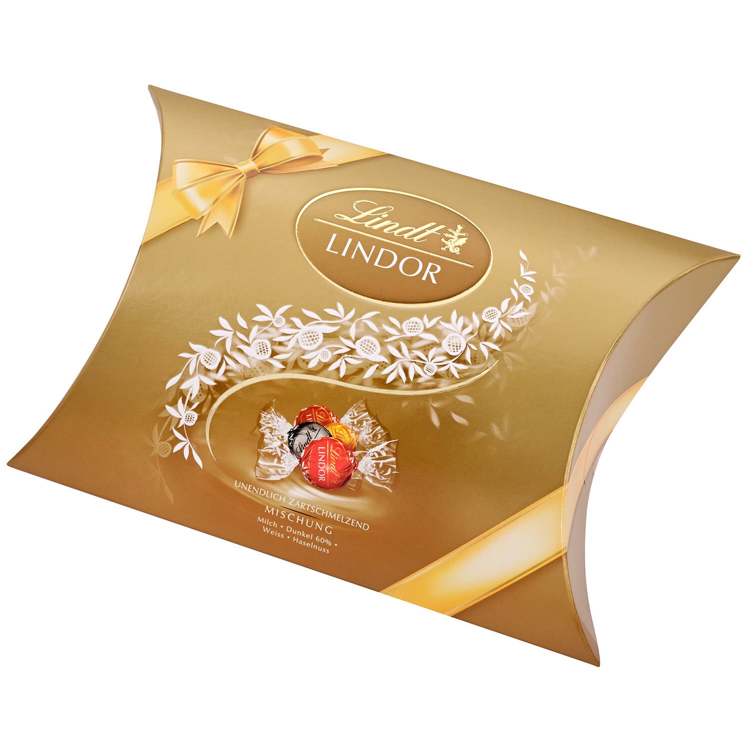 Variatie qua genot. Ontdek het meest delicate geheim van de Lindt Master Chocolatiers: Lindor. Omhuld met de beste Lindt-chocolade zullen uw zintuigen de eindeloos smeltende vulling in de mond ontdekken, die zich ontvouwt tot volledig genot in de mond. Dit kussenpakket is gevuld met Lindorbolletjes in melk, extra puur, hazelnoot en wit.