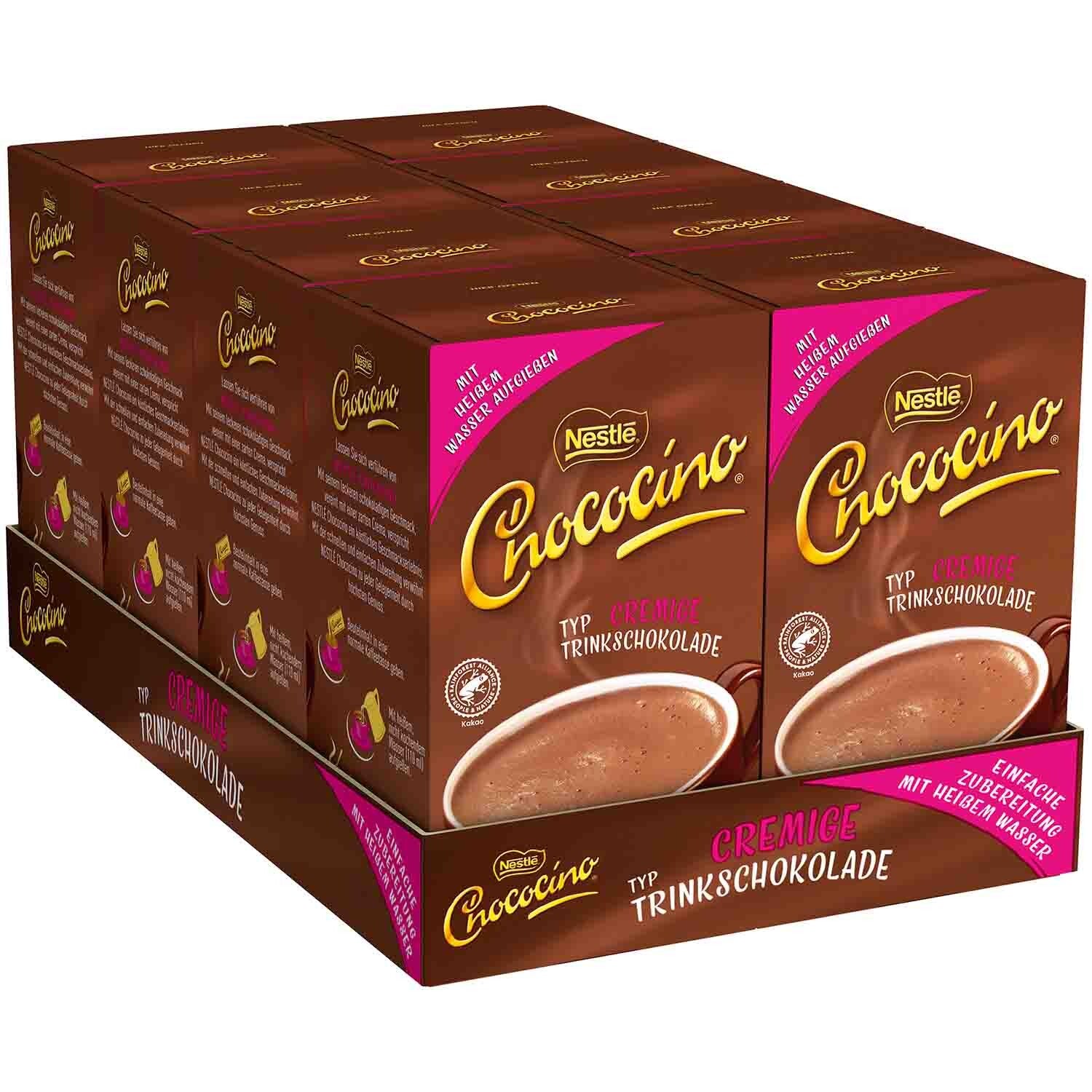 Romig chocoladegenot. De portiezakjes van Nestlé Chococino in een verpakking van 10 stuks zorgen voor een heerlijk aanbod chocoladeachtig drinkplezier in handig verpakte portiezakjes. Het romige drankpoeder kan eenvoudig met heet water worden bereid en overtuigt door zijn volle chocoladesmaak. Bewaar de goed gevulde doos in je keuken of gebruik de praktische tassen om uitstapjes en excursies in te slaan.