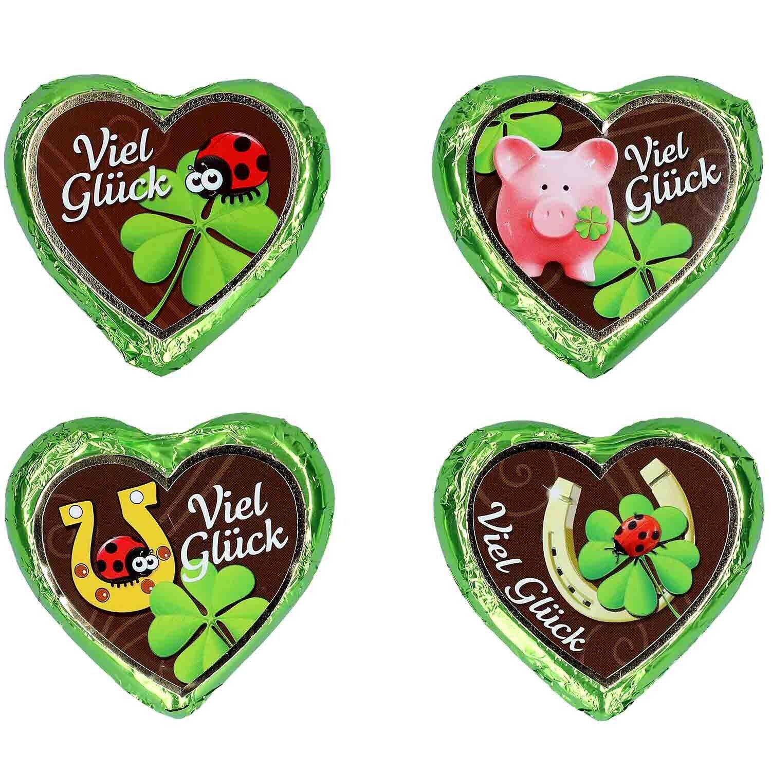 Zoet geluk. Het Günthart Pralinehart Groot "Good Luck" is een hart gemaakt van fijne, milde melkchocolade en een delicaat smeltende nougatcrèmevulling. Het is verpakt in lichtgroen aluminiumfoliepapier en versierd met een kartonnen hart met een van de 4 verschillende motieven die je geluk wensen. Deel het bericht op een lieve manier met je vrienden, collega's of klanten.