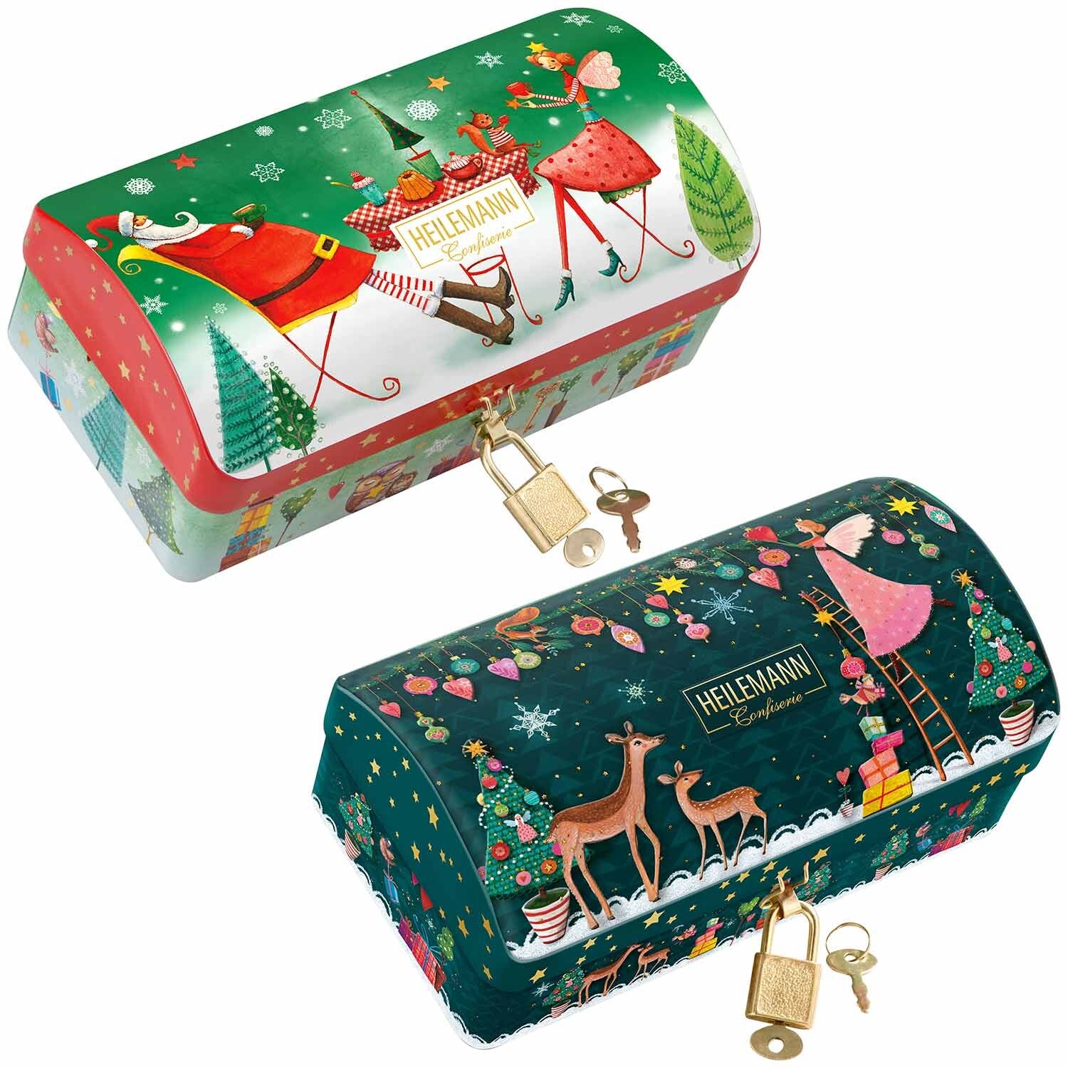 Veilig opgeslagen. De inhoud van de Heilemann-kerstschatkist is zo heerlijk dat ze achter slot en grendel moeten worden bewaard. In het liefdevol vormgegeven metalen blikje, waarop de Kerstman en de kerstfee van een cacaostukje genieten, zitten fijne nougatbrokjes en pralinébolletjes en minifiguurtjes van aromatische fijne melkchocolade. En als je voorraad op is, kun je persoonlijke schatten prachtig opbergen in het blikje met het gouden hangslot.