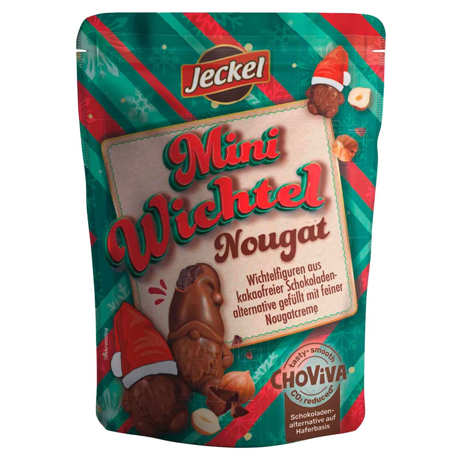 Chocoladeachtige kersttraktatie zonder cacao! Met de heerlijke Jeckel Mini Wichtel Nougat ChoViva kun je een zoete lekkernij verwachten gemaakt van ChoViva. Het cacaovrije chocoladealternatief is gemaakt van haver en biedt chocoladegenot met een gerust geweten. De grappige kabouterfiguren zien er lekker uit om op te eten en zijn gevuld met een delicate nougatcrème.