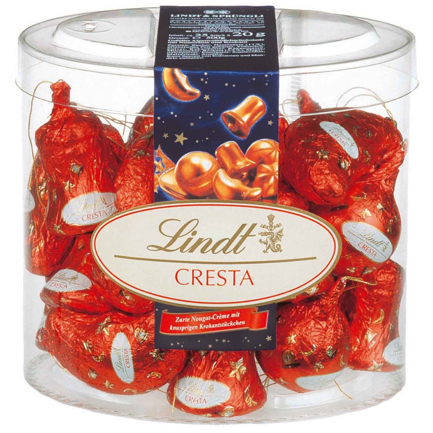 Versier je kerstboom en kleurrijke kerstborden met de Lindt Cresta boomhanger. Hier vind je delicate Alpenmelkchocolade met een vulling van fijne nougatcrème en knapperige brosse stukjes. Het Lindt Cresta boomhangmengsel bevat bellen, bollen en halve manen in decoratiefolie. De pralines kunnen eenvoudig aan de kerstboom worden gehangen met een fijn gouden lint.