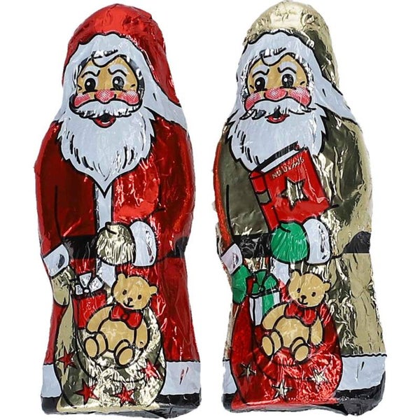 De massieve kerstmannen van Riegelein zijn volledig gemaakt van fijne melkchocolade die smelt in de mond en zien er door hun verpakking gemakkelijk uit om in te bijten. De kerstmannen zijn ca. 5,5 cm groot en zijn ideaal als give-away of klein cadeautje voor collega's of vrienden.