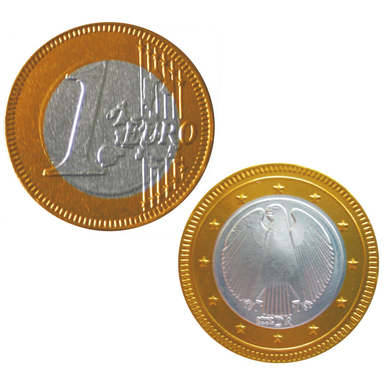 Smeltende munt. Steenland Chocolate Euro's zijn bedrieglijk echt van buiten en chocoladeachtig van binnen. De daalders van heerlijke melkchocolade zijn verpakt in hoogglansfolie met euromuntmotief en zijn prachtig als decoratief element op cadeaus, als "betaling" voor de speelgoedwinkel, als "piratenschat" op kinderverjaardagsfeestjes of gewoonweg als tussendoortje.