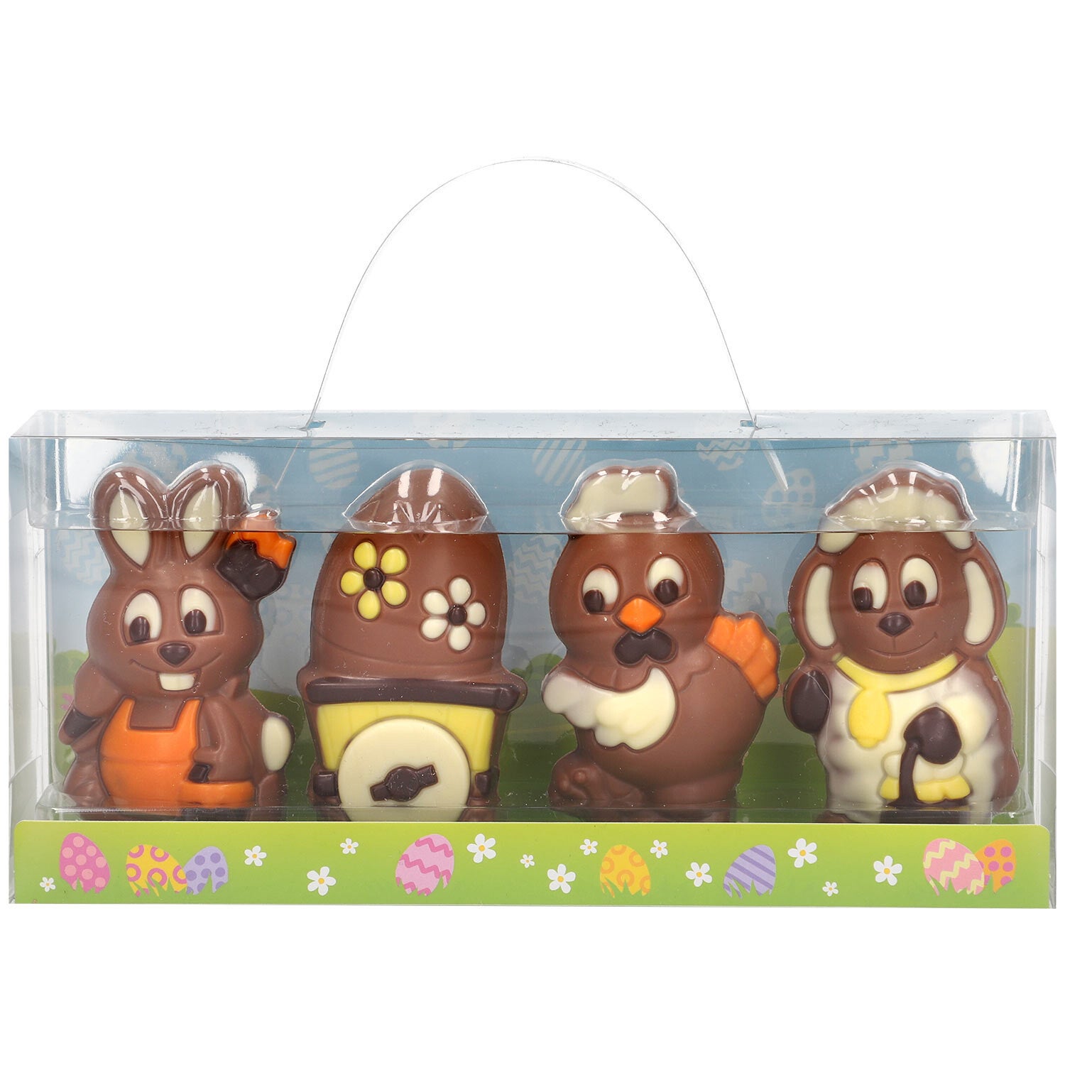 Geschenkverpakking met 4 holle figuren van fijne melkchocolade.