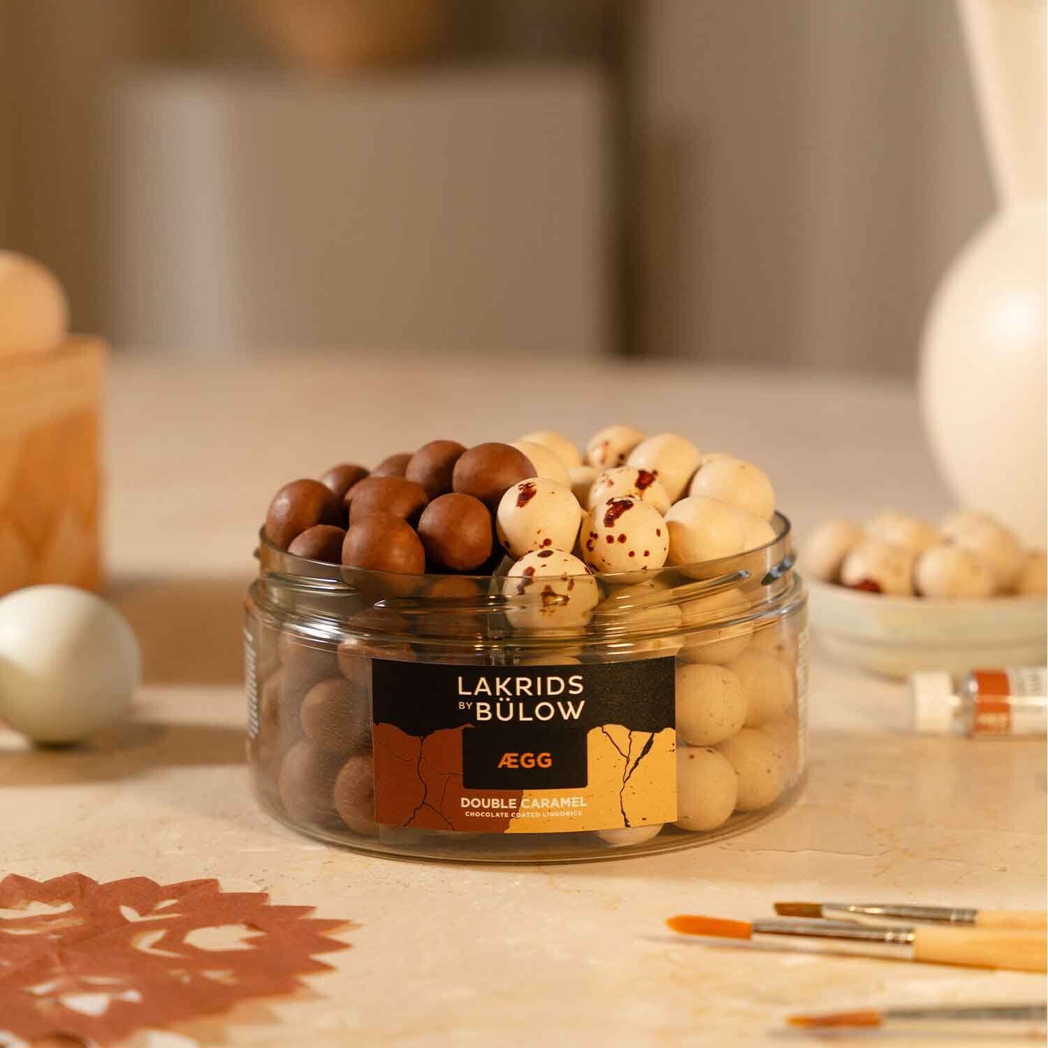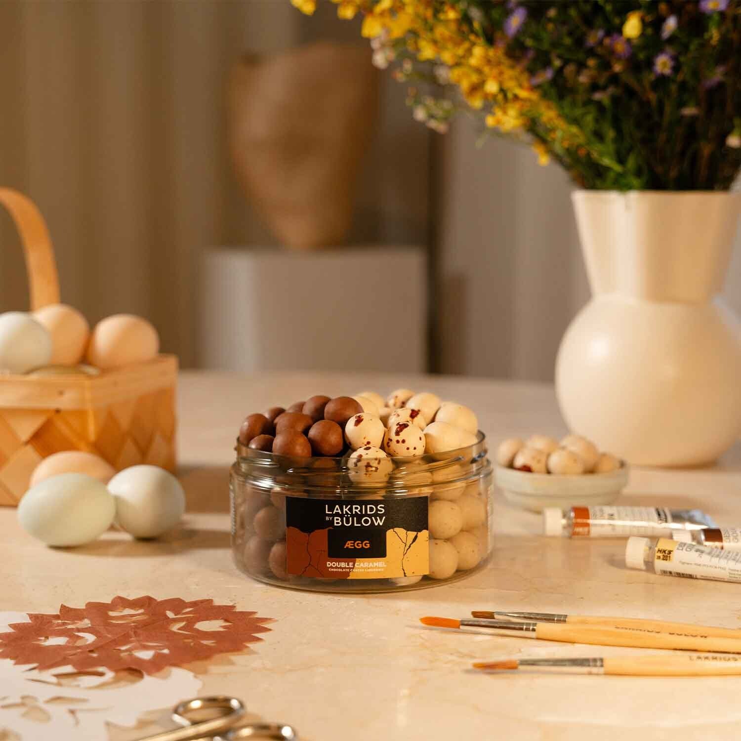 Twee soorten (paas)genot. Met Lakrids by Bülow Ægg Mixed Crunchy Toffee & Crispy Caramel kunt u een exquise selectie van de beste dropballen verwachten. Met Lakrids by Bülow Ægg Crunchy Toffee ervaart u de heerlijkste eieren gemaakt van de beste melkchocolade, verfijnd met Franse boter en room met knapperige karamelvlokken. Het hart bestaat uit een zoute dropkern, die een onmiskenbaar kruidige noot geeft. Lakrids by Bülow Ægg Crispy Caramel hebben een kern van heerlijke premium drop en een laagje fijne Belgische Dulce de Leche chocolade die romig smelt in de mond en u verwent met een aromatische vanillesmaak. Een knapperig zwart dragee-omhulsel rondt de verfijnde dropballetjes op stijlvolle wijze af, terwijl de bepoedering van rauw droppoeder visuele en smaakaccenten geeft. In de geschenkverpakking is deze lekkernij een echte blikvanger in het paasnest.