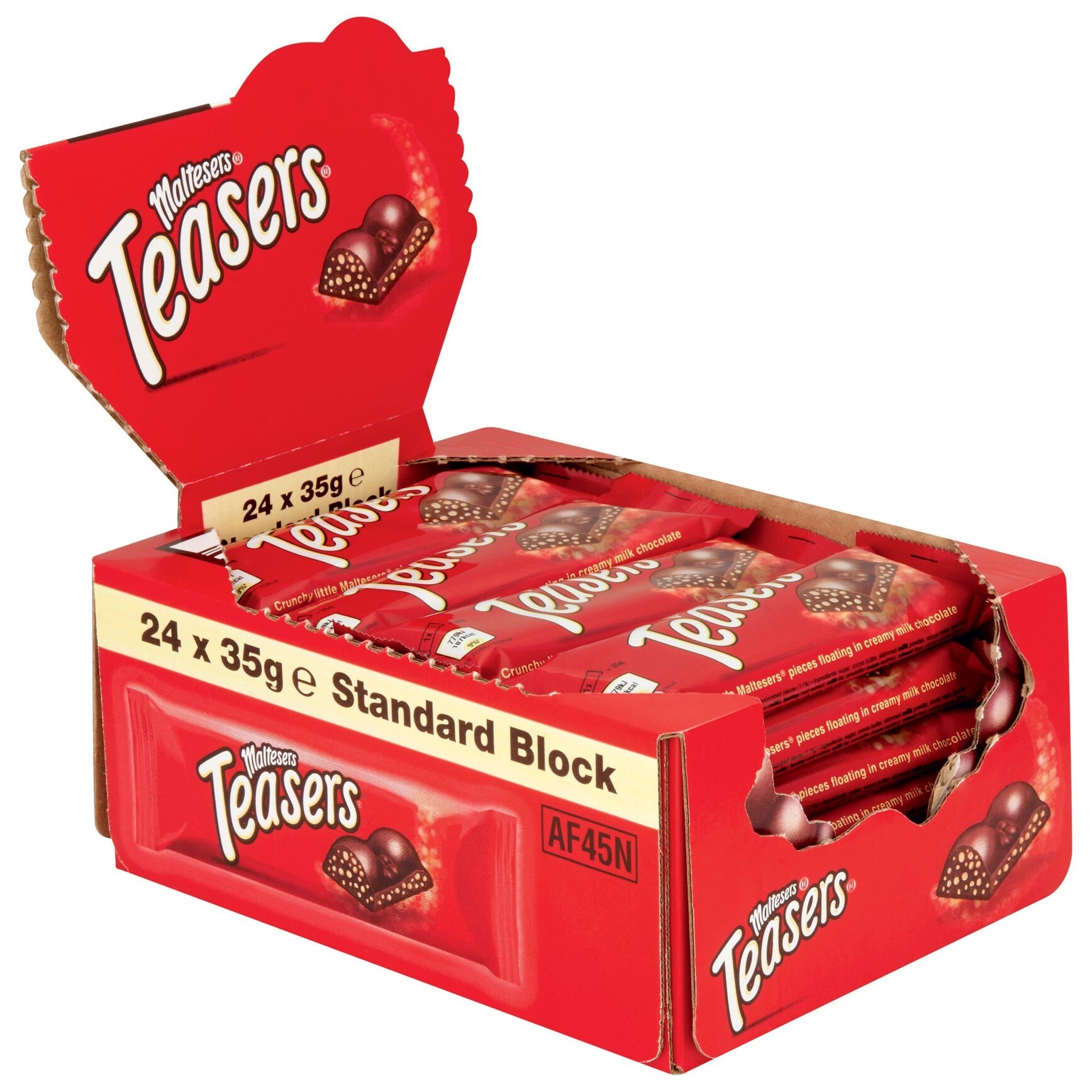 Knapperig en mals. Maltesers Teasers is een chocolade reep gemaakt van melkchocolade met knapperige stukjes mout. Wat als bal doorgaans een genot is voor de tong, is in de vorm van een reep ook een heel bijzondere traktatie. Ontdek de combinatie van smeltend en knapperig snackplezier.