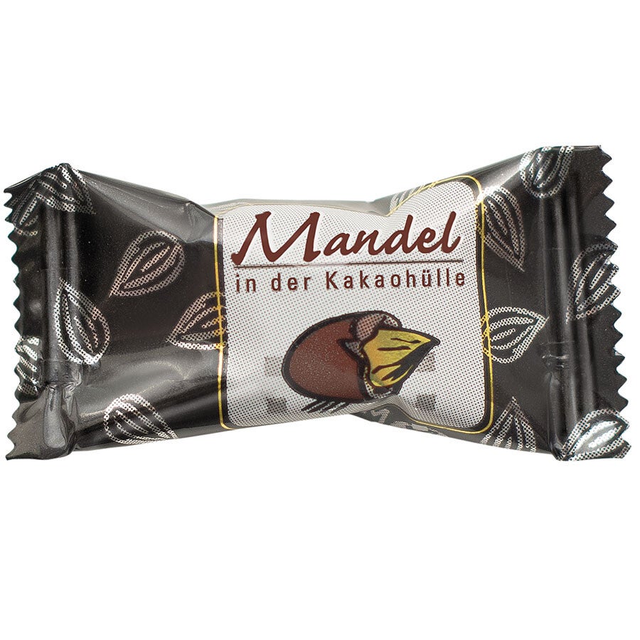 380 individueel verpakte amandelen in pure chocolade met cacaopoedercoating.