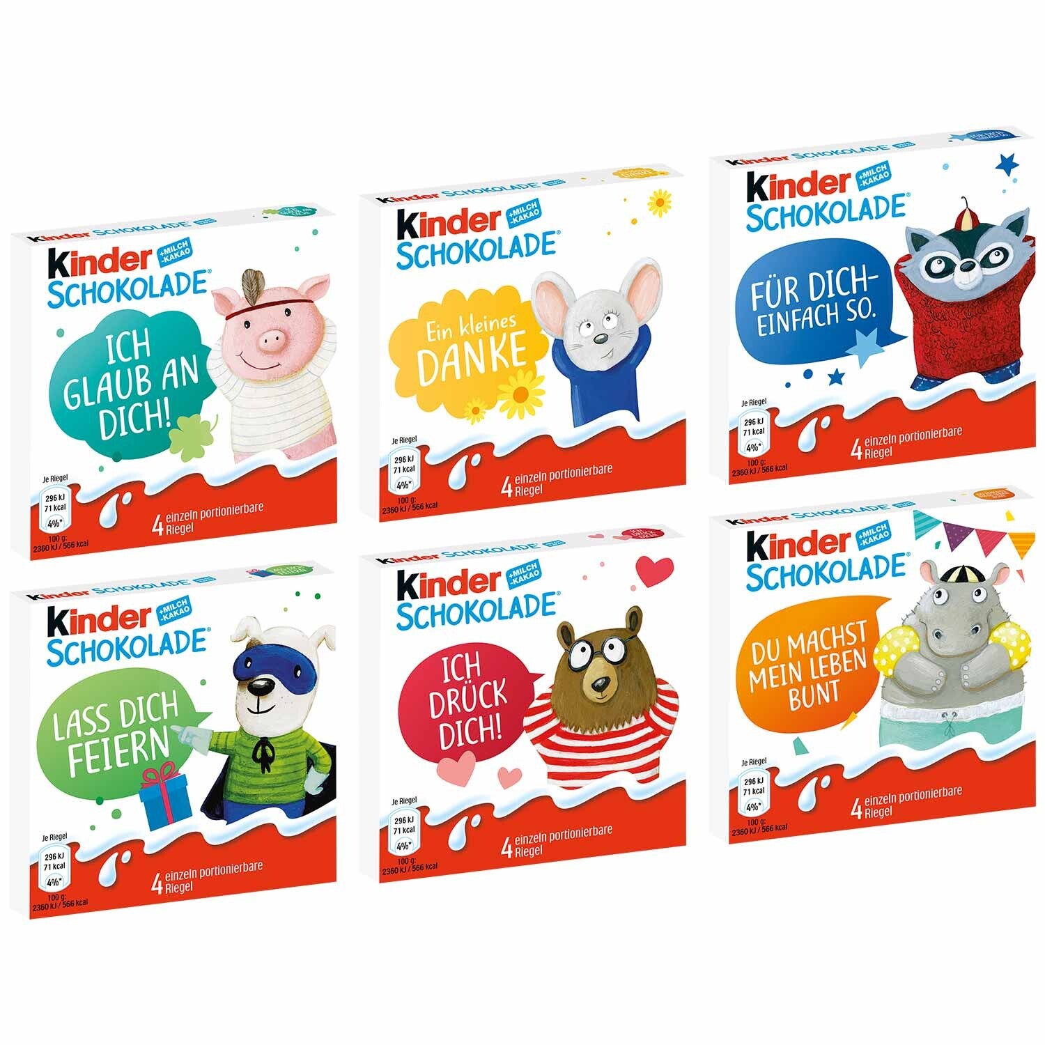 Kleine repen - individueel verpakt. Kinderchocolade is de heerlijke combinatie van heerlijke melkchocolade en een romige melkvulling. Deze creatie betovert al generaties lang jong en oud en smelt gewoonweg in de mond. In deze editie zijn de heerlijke repen bedrukt met liefdevolle motieven en lieve spreuken, waardoor ze ideaal zijn als cadeau.