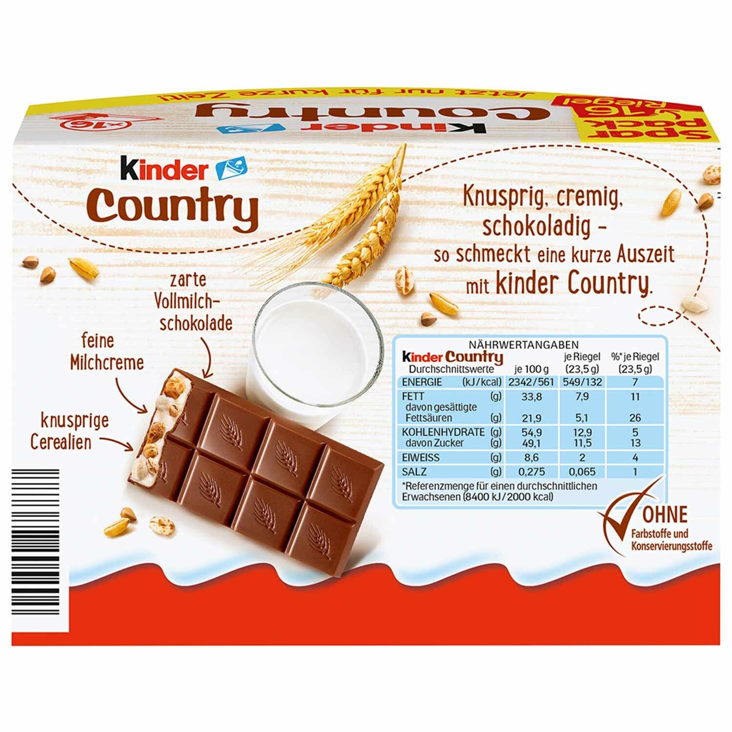 Het beste van het land. Kinder Country is altijd een plezier. De vijf licht geroosterde granen gerst, rijst, tarwe, spelt en boekweit - in een heerlijke melkvulling, omhuld met delicate melkchocolade - geven de reep zijn onmiskenbare smaak. Zo ontstaat een unieke chocoladetraktatie die niet alleen heerlijk knapperig, maar ook romig is. Met deze grote XXL-verpakking bent u lang en lekker voorzien.